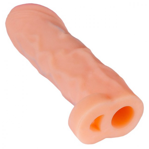 Сама насадка выпол­нена из потря­сающего мате­ри­ала нового поко­ле­ния - неоскин. Мяг­кий, неж­ный, подат­ли­вый мате­риал гаран­ти­рует самые реа­ли­стич­ные ощуще­ния! А, выпук­лые венки и ярко выражен­ная уве­ли­чен­ная головка  дарят допол­ни­тель­ную стиму­ляцию! Петелька-​эрекционное кольцо обес­пе­чи­вает надеж­ную фик­сацию насадки, и кроме того, про­дле­вает муж­чине время поло­вого акта!